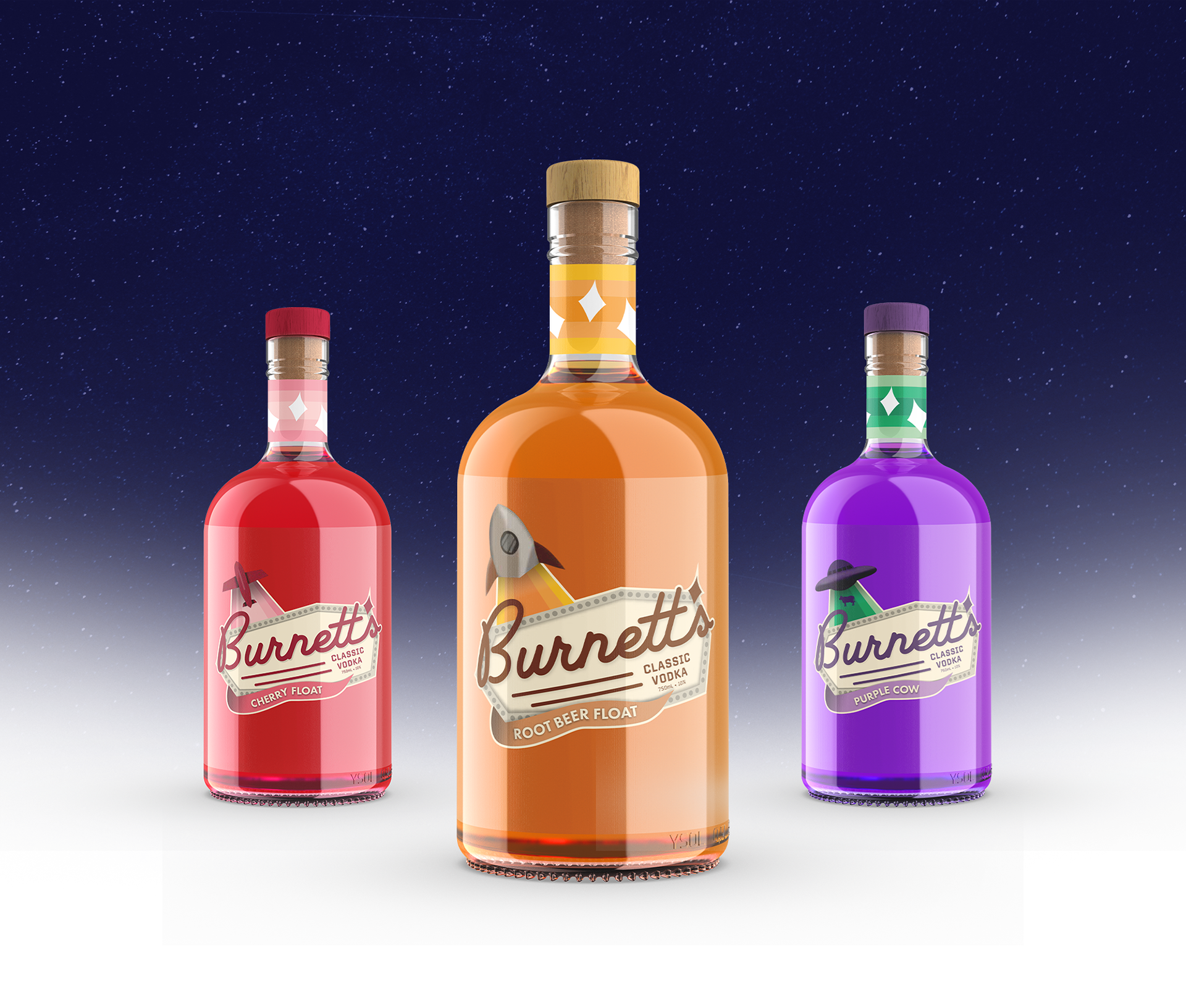 Burnett's Classic Vodka is a liquor label system that calls back to googie architecture and the space age. Each flavor is symbolized a flying object to create a system that makes these objects synonymous with a taste.